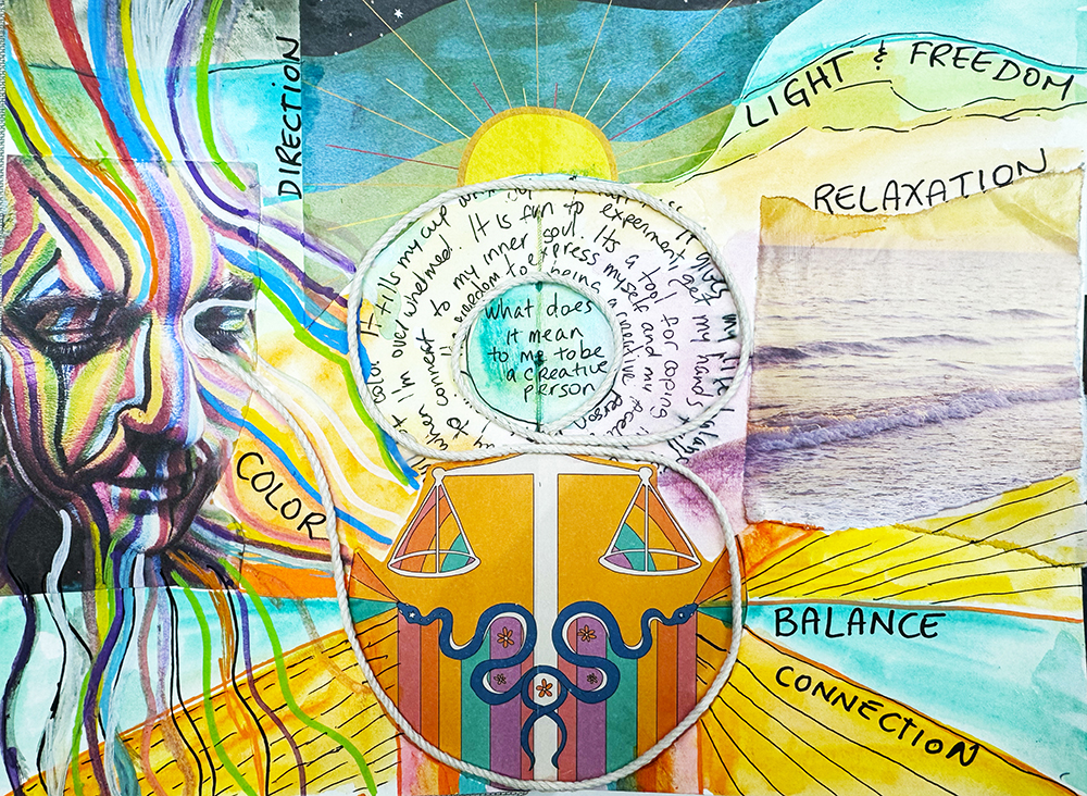 By blending these elements with writing and imagination techniques, we will create a visual SoulPages® spread that reconnects us with our inner artist, reigniting our passion and creativity. Each of you will craft a unique page, using colors, images, and words that resonate with your personal connection to your inner artist.