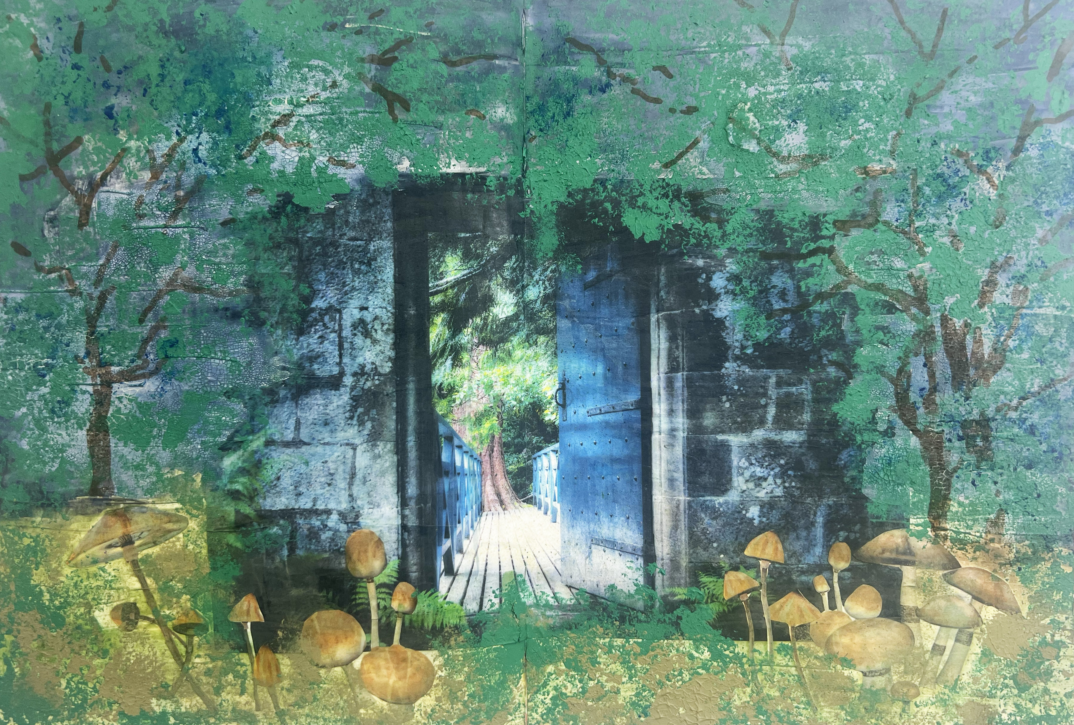 That's how I felt when I created this art journal spread. The blue door is a gateway to a beautiful magical forest where fairies roam and soft green moss carpets the ground so you can just lay down and take a nap and dream.